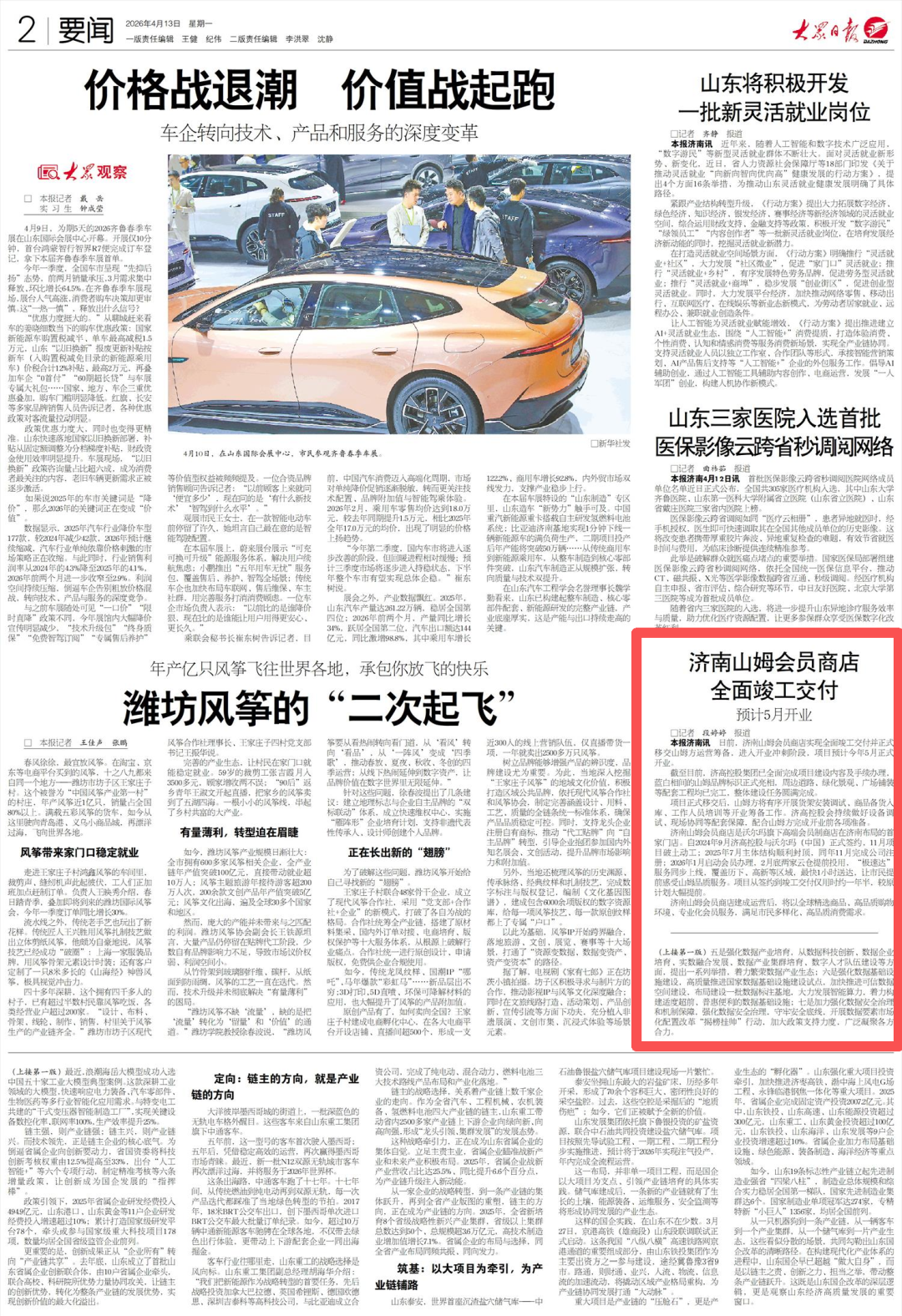 4月13日,《大众日报》刊发tqb谈球吧济南山姆会员商店项目竣工交付,已全面完成项目建设内容及手续办理,周边道路、绿化景观、广场铺装等配套工程均已完工,整体建设任务圆满完成。原文如下: